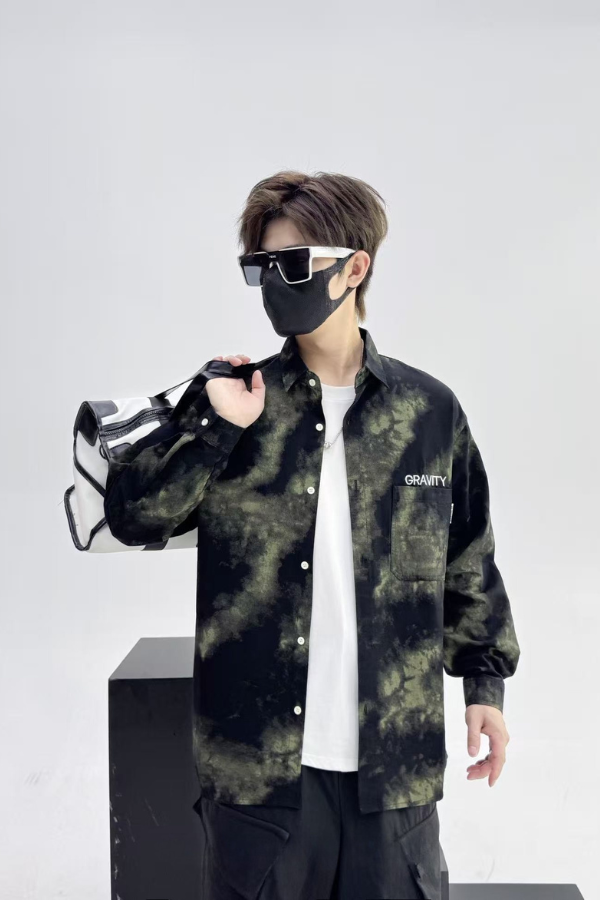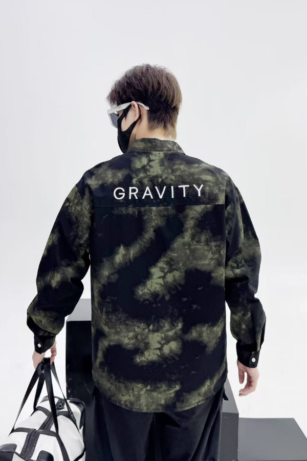 Elevate your streetwear game with the Cosmic Stain Shirt — a fusion of cosmic chaos and grounded design. Featuring a bold green-black bleach wash and a crisp GRAVITY logo on the chest pocket, this long-sleeve shirt gives off an interstellar vibe while keeping it street-smart.